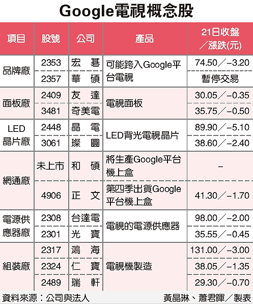 〔記者王憶紅/台北報導〕市場傳出,受到美國三大電視網同步抵制Google TV,相關概念股恐受衝擊。兆豐國際認為,Google TV的設計與民眾的收視習慣有不小差異,且非吃到飽方案,加上原先電視內容提供者又聯合抵制的情況下,媒體先前對Google TV的報導恐過於樂觀,建議投資人不妨回歸整個連網電視的概念股,投資首選為智易(3596),投資評等為「逢低買進」,目標價為84.5元。