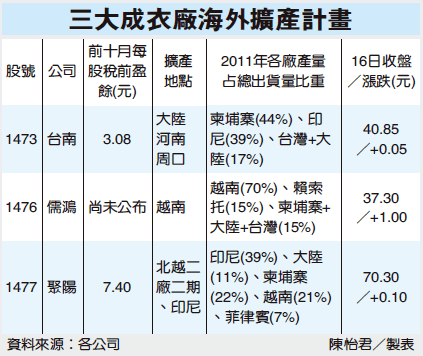 成衣三雄看好市場前景,加碼擴建產線,聚陽實業(1477)及儒鴻(1476)皆加碼越南的產能,台南企業(1473)將在大陸河南增設成衣廠,未來將瞄準快速成長的大陸內需市場,接當地品牌的代工訂單。