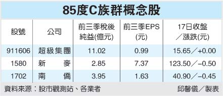 由於KY美食本益比高達24 倍,遠高於國內一般食品族群的十至12倍,超級集團、新麥與南僑在成為「85度C概念股」後,可望跟著沾光,法人預期將有一波比價行情。