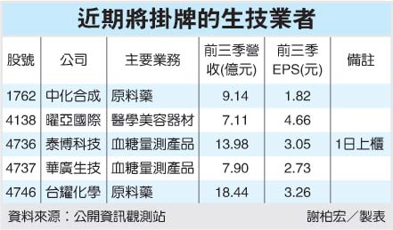 生醫技族群自今天日起至明年第一季底前,將出現五家準掛牌上市櫃新兵,繼泰博(4736)今天以70元承銷價率先上櫃後,元大證券也宣布,台耀已獲交易所上市審議會通過上市許可。元大證是台耀上市的主辦券商。
