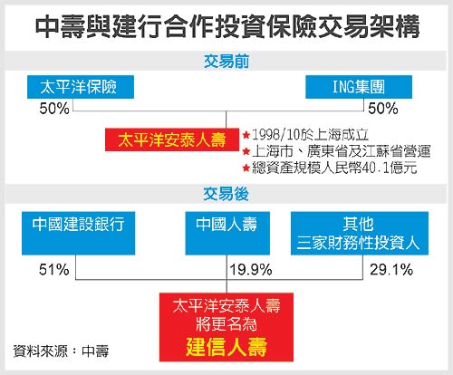 中壽董事會昨天通過建信人壽的參股案,並即舉辦法說會宣布。同時,建行也在北京宣布,將與太平洋保險集團簽署股權交易協議。