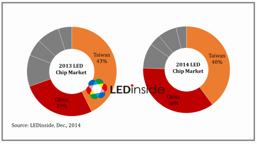 LEDinside指出,2014年全球MOCVD新增裝機數量將達239台,而2015年則因中國部分地方政府持續有補貼的措施出籠,預計仍維持170台以上的裝機規模。儲于超表示,LED廠商擴產計畫取決於地方政府的補助款,因此未來LED晶片廠將會呈現大者恆大現象。隨中國LED晶片廠的技術提升以及產能釋出,中國佔全球LED晶片產值的比例可望由2013年的27%,提升至2014年的36%(見附圖)。