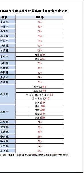 103 年度各縣市有線廣播電視基本頻道收視費用彙整表