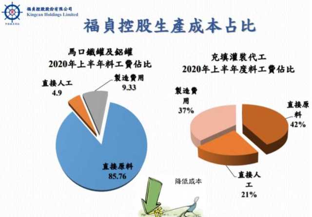 就上半年產品別營收佔比,三片式馬口鐵罐65%、二片式鋁罐34%、充填灌裝代工1%,福貞表示,進入第三季傳統旺季,相信在下半年的拉抬下,鋁罐全年營收佔比有機會上升至40%或以上。而在生產成本分布上,馬口鐵罐及鋁罐以鋁材和鍍錫鐵等直接原料佔85.76最高、製造費用9.33%、直接人工4.9%;充填灌裝則以直接原料42%較多、製造費用37%、直接人工21%(見下圖,福貞-KY法說)。