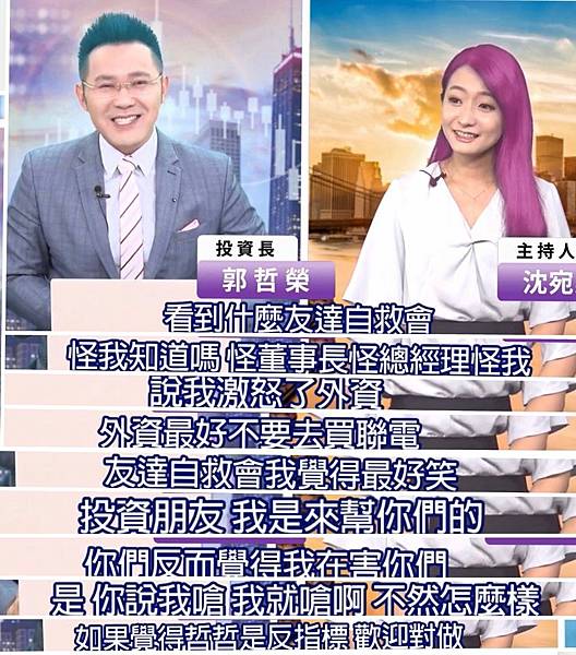 但這不是終點,我們會再重新出發!—————————————- 8/30 新增訴求第三點 第三點:本群組高級幹部認為面板股被外資針對與摩爾投顧的郭哲榮有相當大的關係,由於該投顧分析師在七月至八月在節目上一直挑釁外資,說外資分析師都不如他,也常在節目上說有本事跟他對做保證你很快就畢業,並且在8/4的節目上叫大家趕快買面板股,如此囂張跋扈的態度可能造成外資的不滿,才會刻意發利空報告打壓面板造成股價大跌,本群接近3000多人投票一直通過要求郭哲榮分析師解釋清楚,如果郭大投顧不接受,本會不排除號召散戶要求zoey出來面對