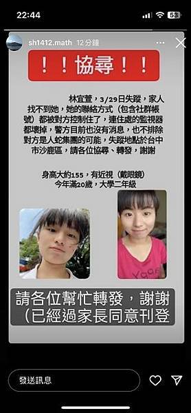 這起案件發生在上個月29日。林女原與家人相約清明連假期間返家,卻遲遲未返家,電話又連繫不上,聯繫房東上門協尋未果,因此在4月2日向警方報案,而警方調閱監視器追查,林女身穿一身黑衣,3月29日上午8時許,離開宿舍後,就此音訊全無,家屬發現後委請房東前往林女租屋處查訪未果後,4月2日向警方報案。
